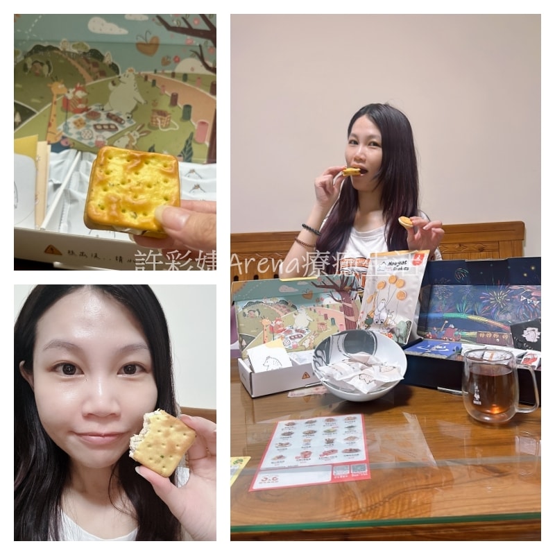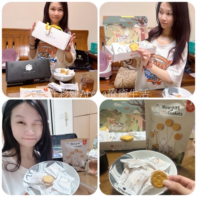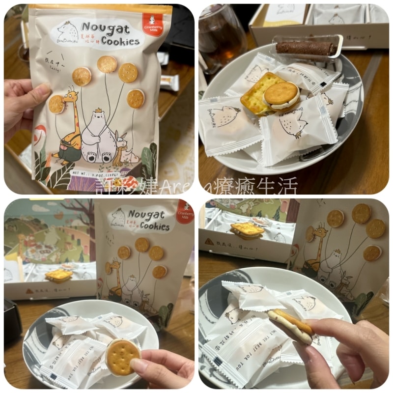牛軋糖的牛奶香甜,吃多不會太黏膩,曾經吃過牛軋糖超黏牙,不舒服單吃口味也會太甜,沒想到這樣搭起來再配一杯熱茶,超合拍!!!在口中是那樣的有餘韻,蔥花也太香了!餅乾的脆真的是一盒一直吃都不夠吃,好吃會一直吃一直吃,停不下來~超ㄙㄨㄚˋ嘴(台語),我本身是很怕吃「酸」的人,蔓越莓剛好夾在裡面不會太甜也不會太酸是好滋味。